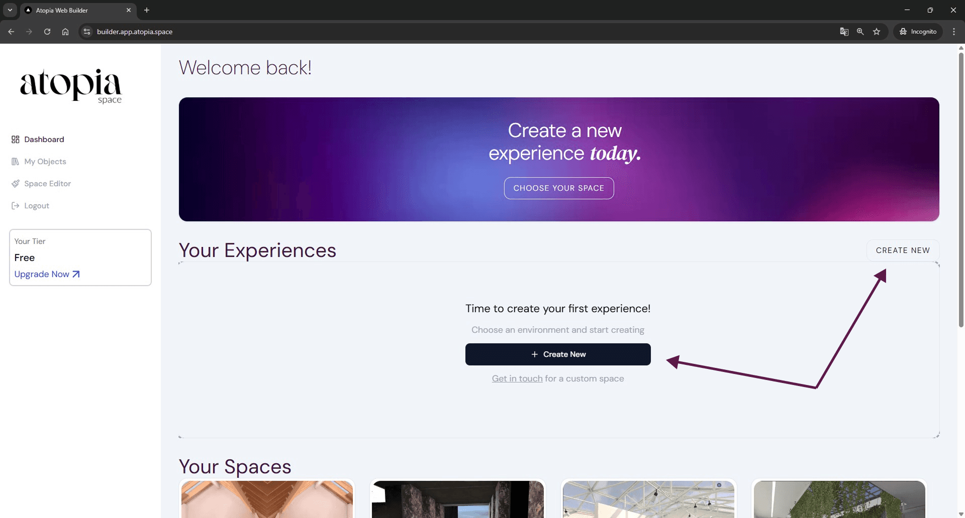 Once you’re in, you’ll see several free demo spaces in your Dashboard. To start creating, click “Create New”.
